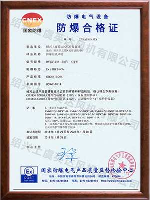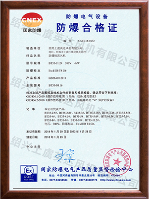 為適應(yīng)防爆環(huán)境需要,風(fēng)機(jī)可做成防爆風(fēng)機(jī),防爆等級為EXdⅡBT4,適用于易燃、易爆氣體的場所。整機(jī)通過國家防爆認(rèn)證。