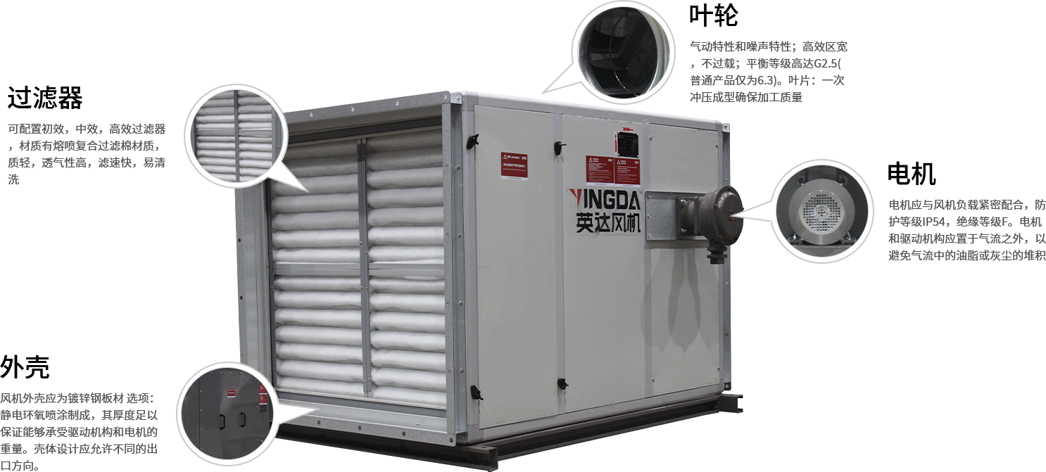 風(fēng)機(jī)可加配初效、中效或高效過濾器,以提高空氣的清潔度,配置過濾器時應(yīng)考慮實際壓力損耗并需適當(dāng)增加箱體長度。