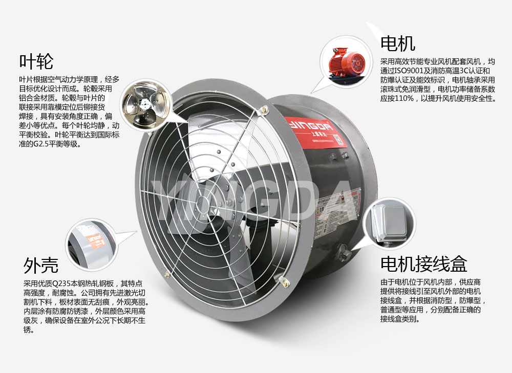 英達(dá)風(fēng)機(jī)采用生產(chǎn)電機(jī)生產(chǎn)設(shè)備和檢查手續(xù)齊全的風(fēng)機(jī)專用配套電機(jī),均通過ISO9001及消防高溫3C認(rèn)證和防爆認(rèn)證及能效標(biāo)識(shí)。電機(jī)應(yīng)與風(fēng)機(jī)負(fù)載緊密配合,采用B3安裝結(jié)構(gòu)。電機(jī)防護(hù)等級(jí)為IP54,絕緣等級(jí)F級(jí),溫升等級(jí)B級(jí)。電機(jī)軸承應(yīng)為滾珠式免潤(rùn)滑型。電機(jī)功率儲(chǔ)備系數(shù)應(yīng)按110%取,以提升風(fēng)機(jī)使用的安全性。