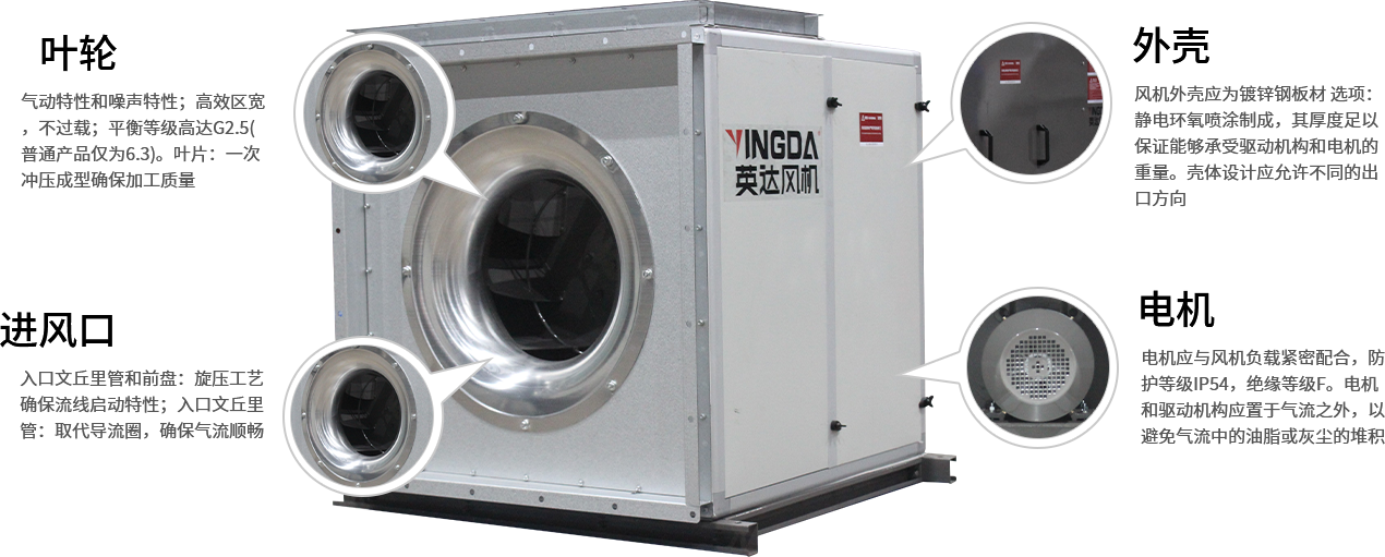 電機應(yīng)與風機負載緊密配合,防護等級IP54,絕緣等級F。電機和驅(qū)動機構(gòu)應(yīng)置于氣流之外,以避免氣流中的油脂或灰塵的堆積。