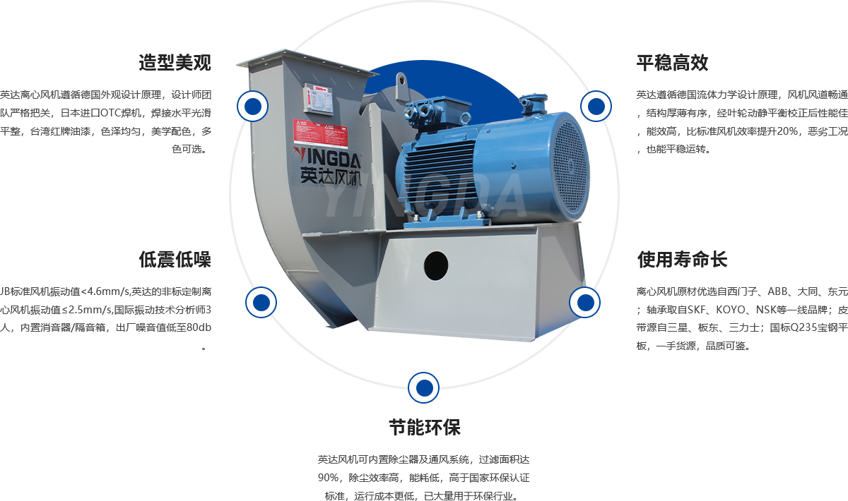 風(fēng)機(jī)葉輪、機(jī)殼可選用優(yōu)質(zhì)Q235碳鋼,304不銹鋼,玻璃鋼纖維,全部模具化生產(chǎn),采用電焊、手段,表面清潔平整、不存在焊接變形現(xiàn)象,葉輪經(jīng)動(dòng)、靜平衡校正,其平衡精度不大于4.0級(jí)。