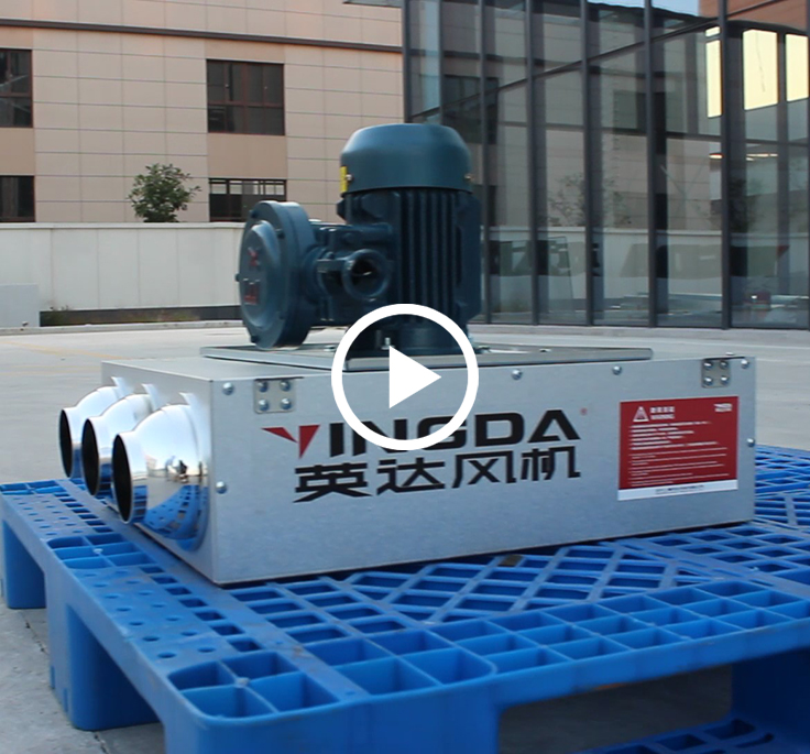 1.1.YDF型誘導風機主要用于無風管條件下,將多臺誘導風機按一定距離和方向依次排列,以少量高速噴流氣體帶動誘導周圍靜止的空氣,達到高效經濟的通風換氣效果。也可單獨布置在通風死角區(qū),通過誘導風機高速噴流達到稀釋廢氣作用。
